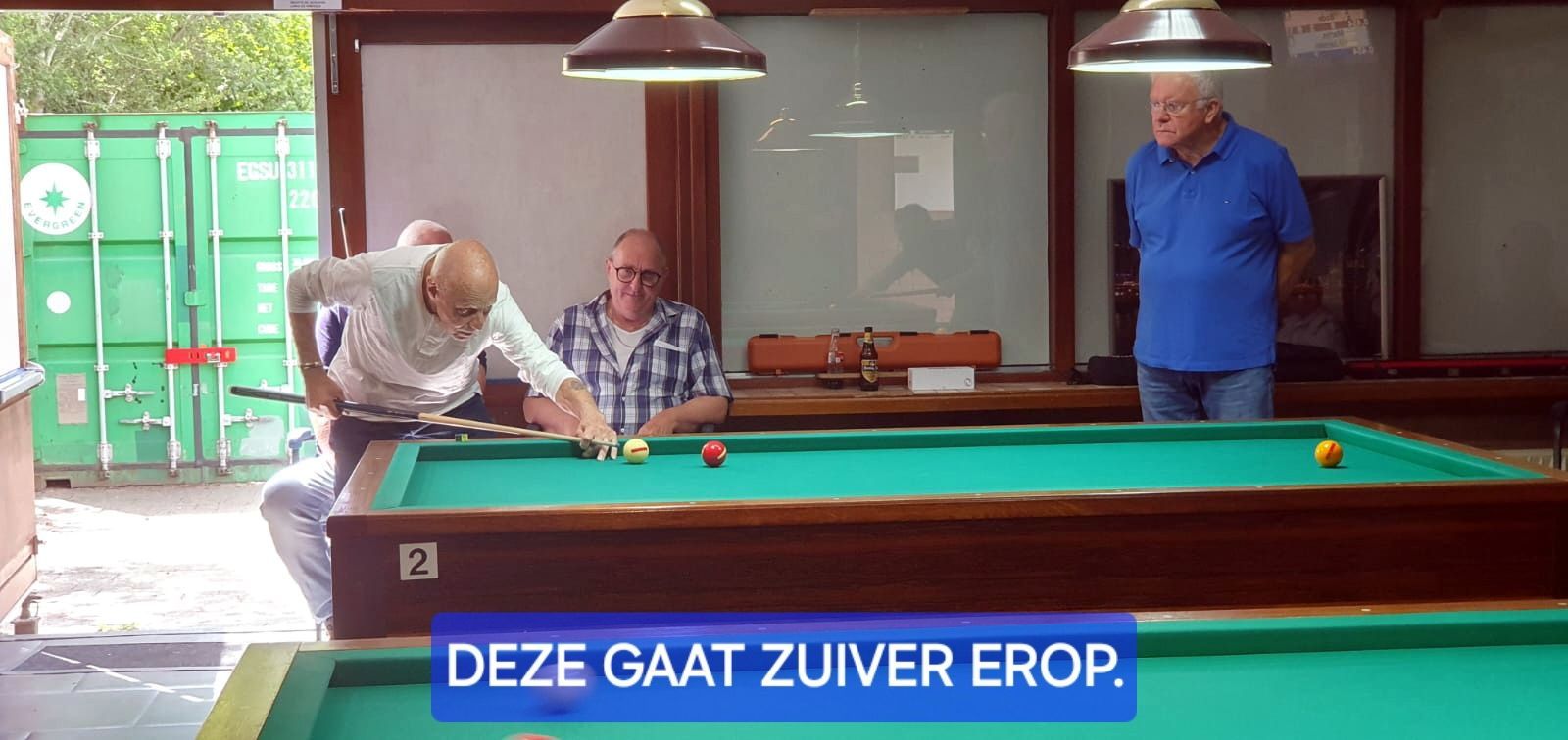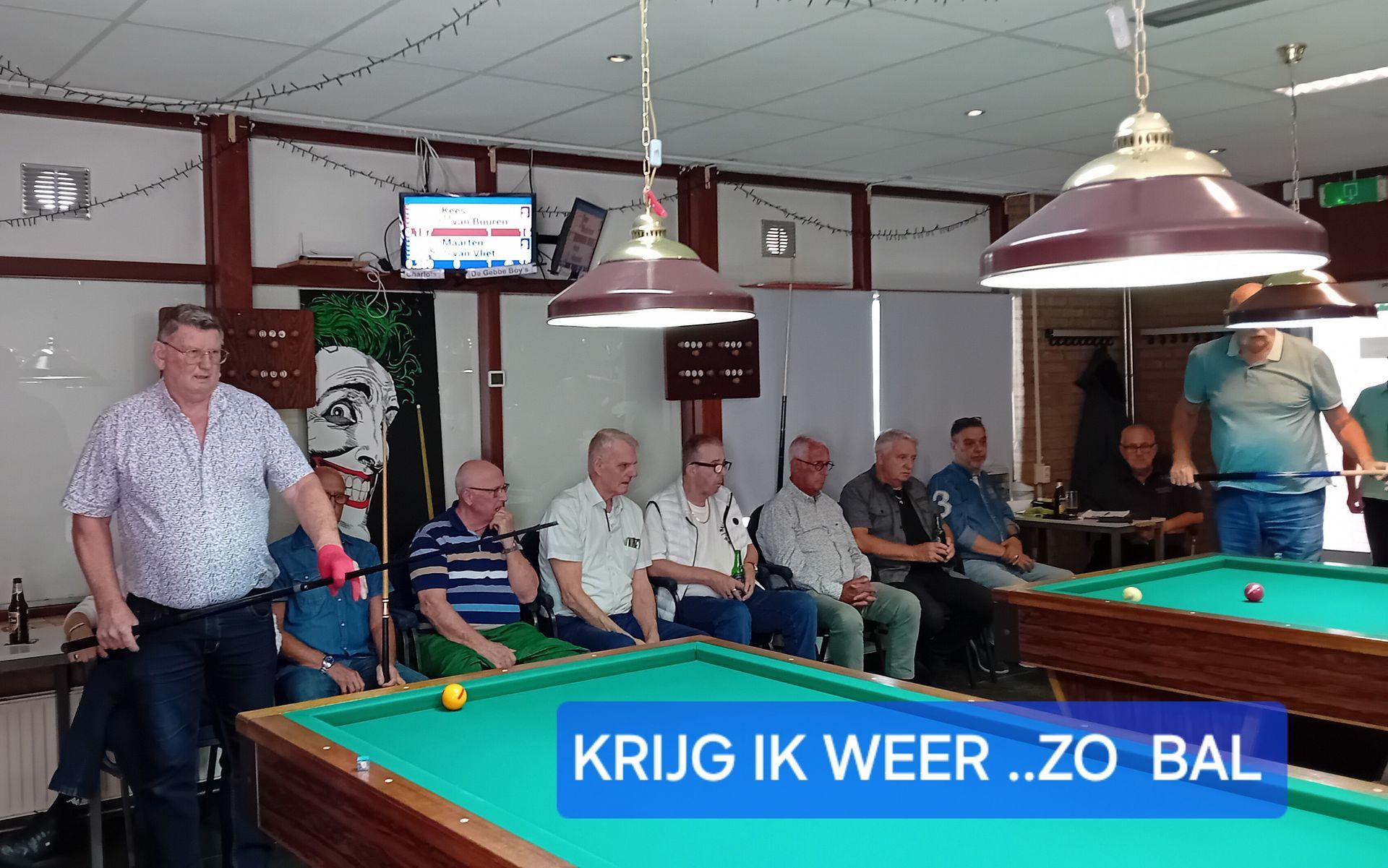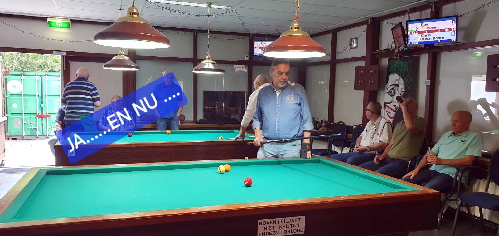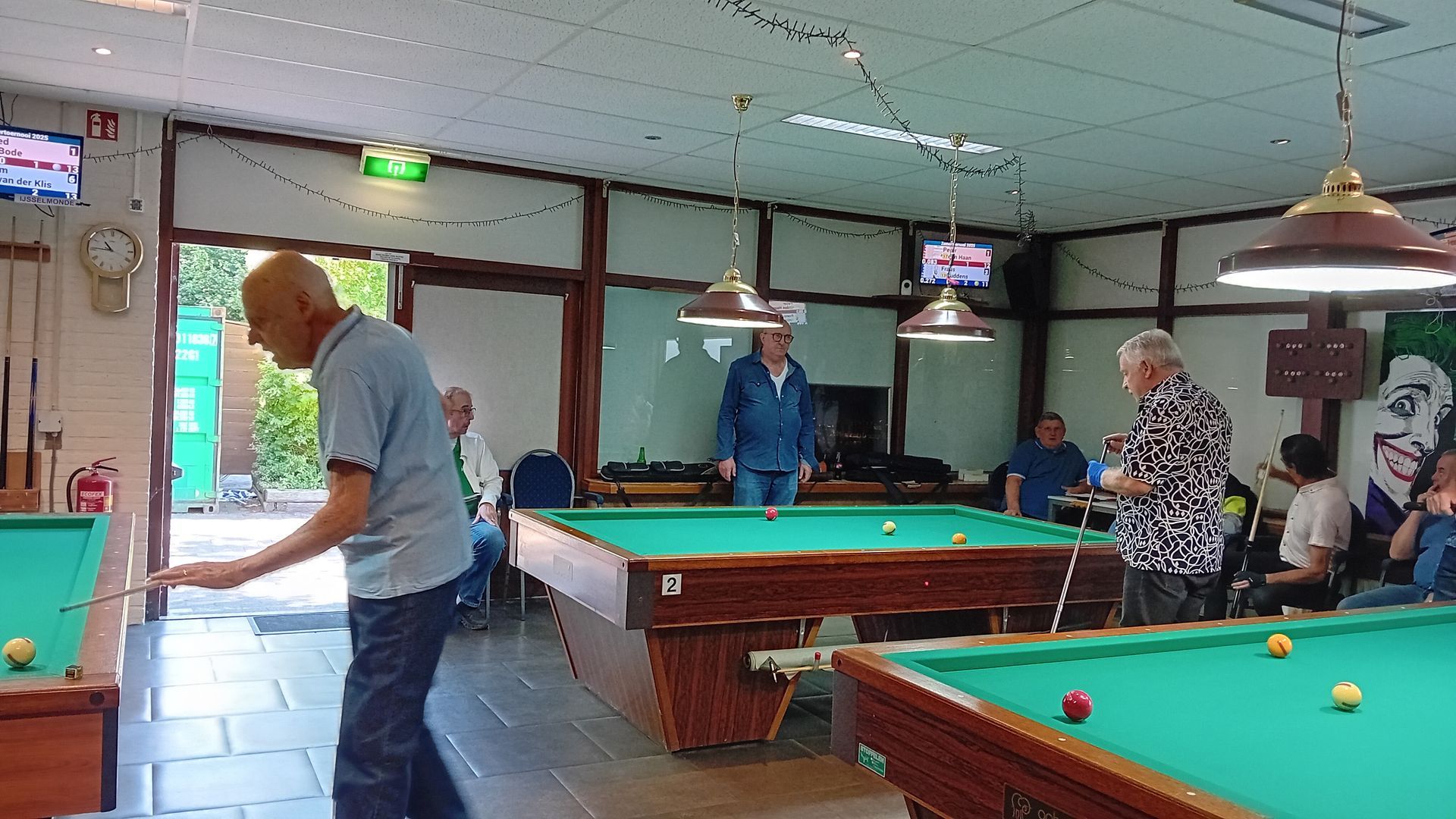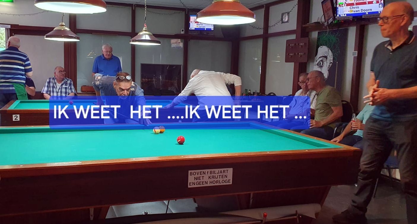 Maar wat wordt er gezegd ....gezelligheid kent geen tijd.πΊπΊ Hoop dat een ieder het naar zijn zin heeft, nou wij wel. Hoor wel zo nu en dan in mijn oor....lang zitten heb de laatste partij. Daar hebben wij alle begrip voor en er is maar 1 oplossing, gewoon ff gezellig komen beppen bij de bar.π En wat is er gebeurd, de hoogste serie is verbeterd door Leo Steer met een serie van 5. Zien we woensdag a.s. een serie van 6? De kortste partij is ook verbeterd door Henk Nossent in 21 beurten. Roy Toonen ging s' middags ook goed maar het lukte net niet om Henk te verslaan. Roy was in 22 beurten uit. Gefeliciteerd heren, er werd goed gespeeld. De moyennes worden steeds beter. Toppers.ππ Tot woensdag 2 juli.