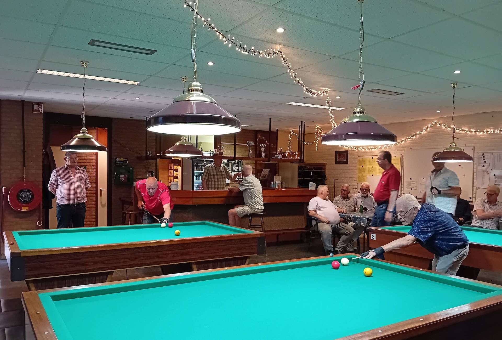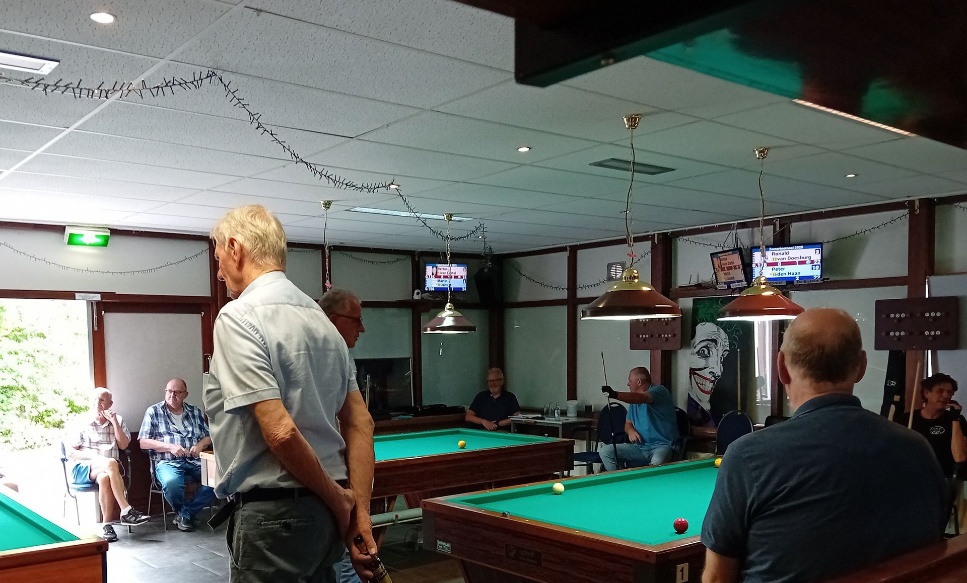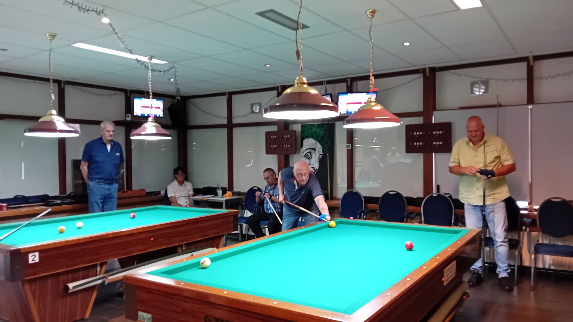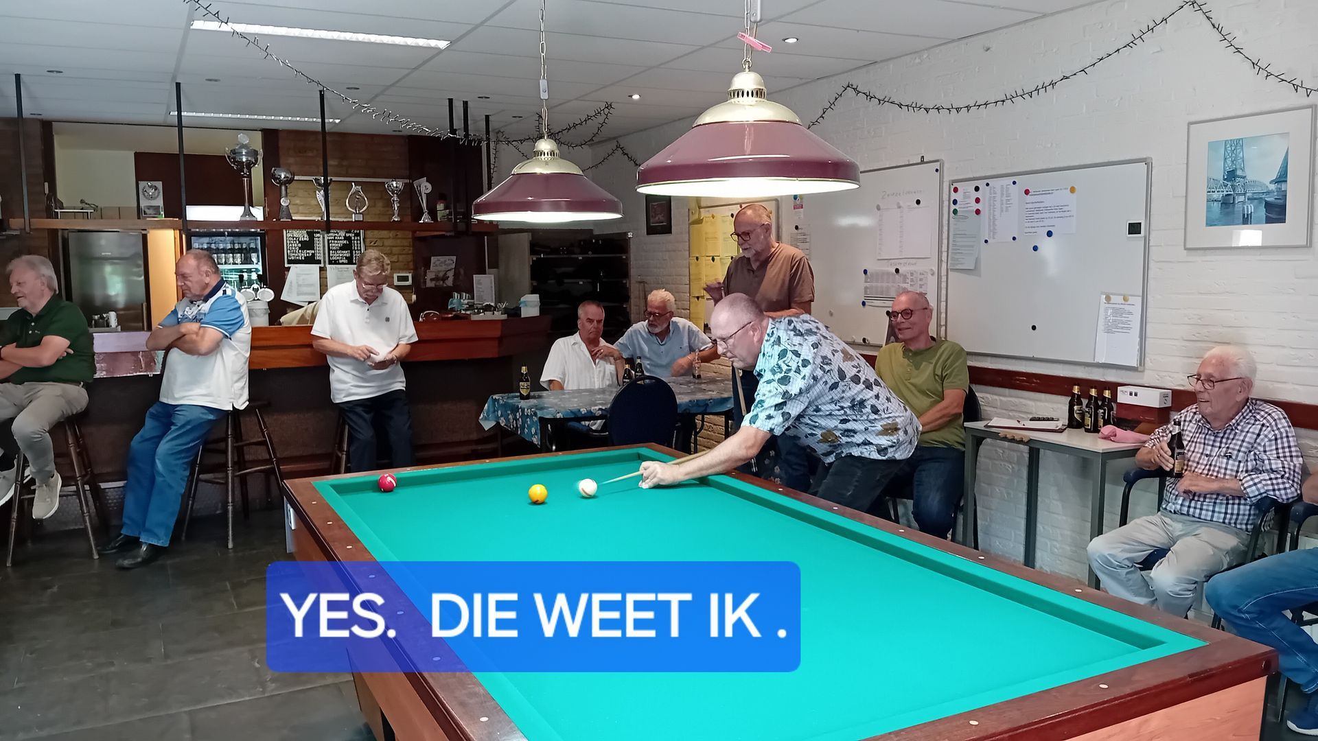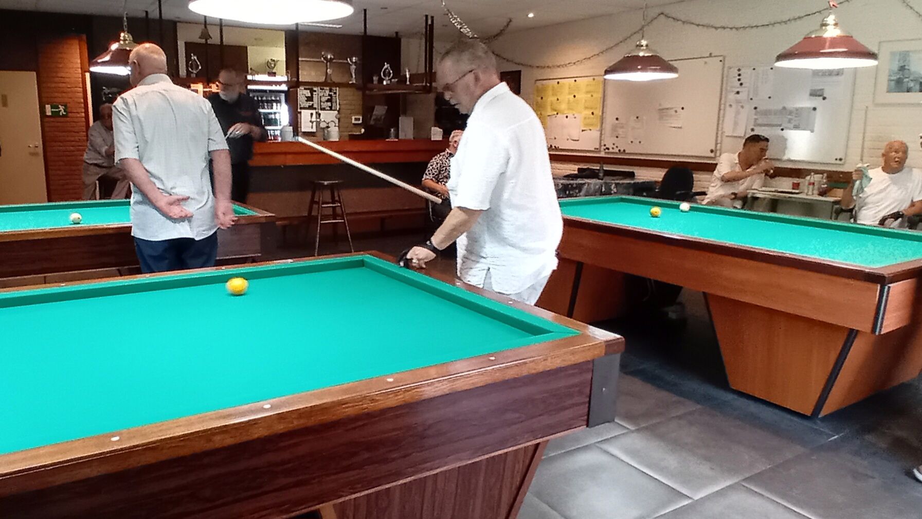 Maar wat wordt er gezegd ....gezelligheid kent geen tijd.πΊπΊ Hoop dat een ieder het naar zijn zin heeft, nou wij wel. Hoor wel zo nu en dan in mijn oor....lang zitten heb de laatste partij. Daar hebben wij alle begrip voor en er is maar 1 oplossing, gewoon ff gezellig komen beppen bij de bar.π En wat is er gebeurd, de hoogste serie is verbeterd door Leo Steer met een serie van 5. Zien we woensdag a.s. een serie van 6? De kortste partij is ook verbeterd door Henk Nossent in 21 beurten. Roy Toonen ging s' middags ook goed maar het lukte net niet om Henk te verslaan. Roy was in 22 beurten uit. Gefeliciteerd heren, er werd goed gespeeld. De moyennes worden steeds beter. Toppers.ππ Tot woensdag 2 juli.