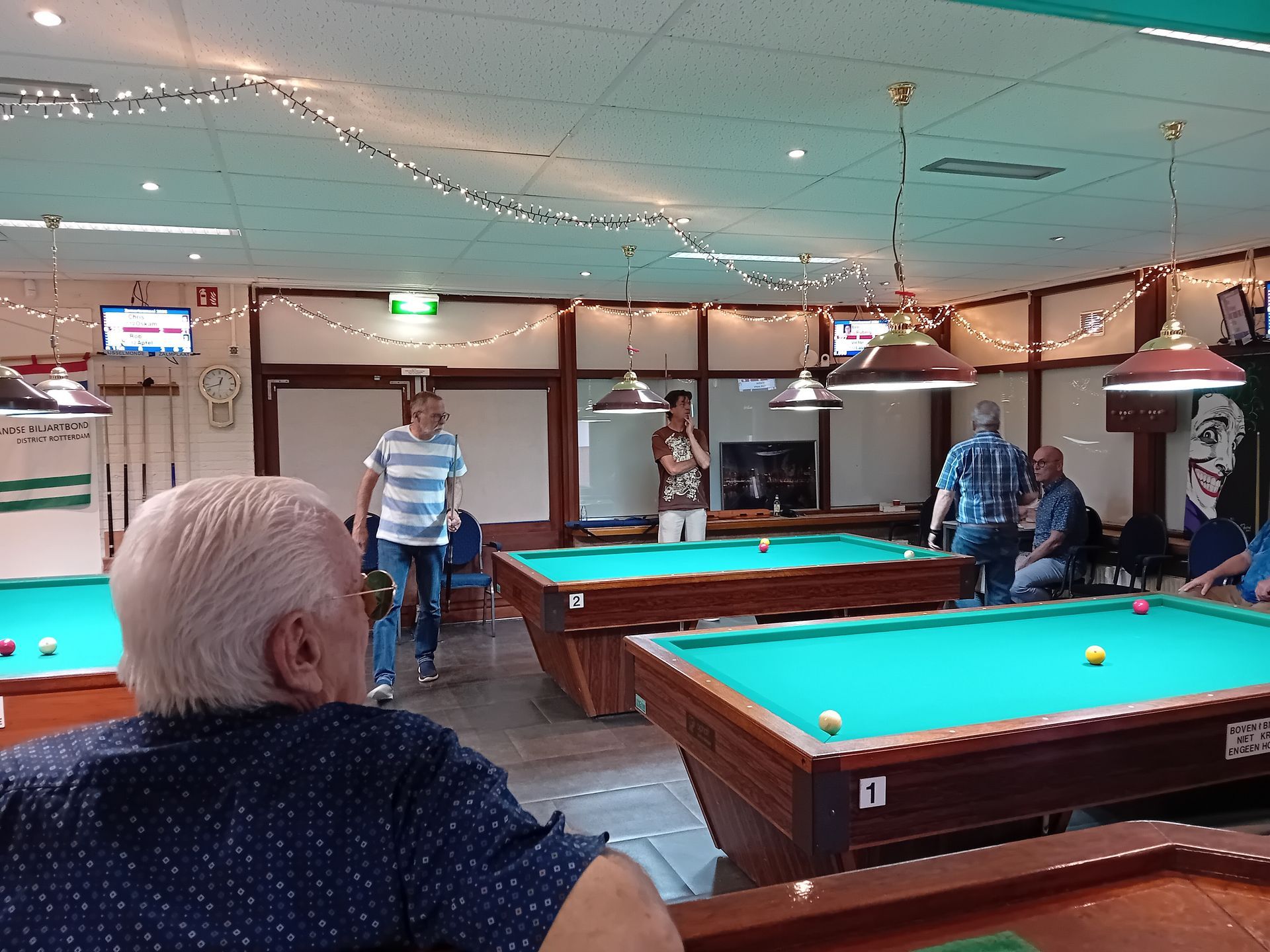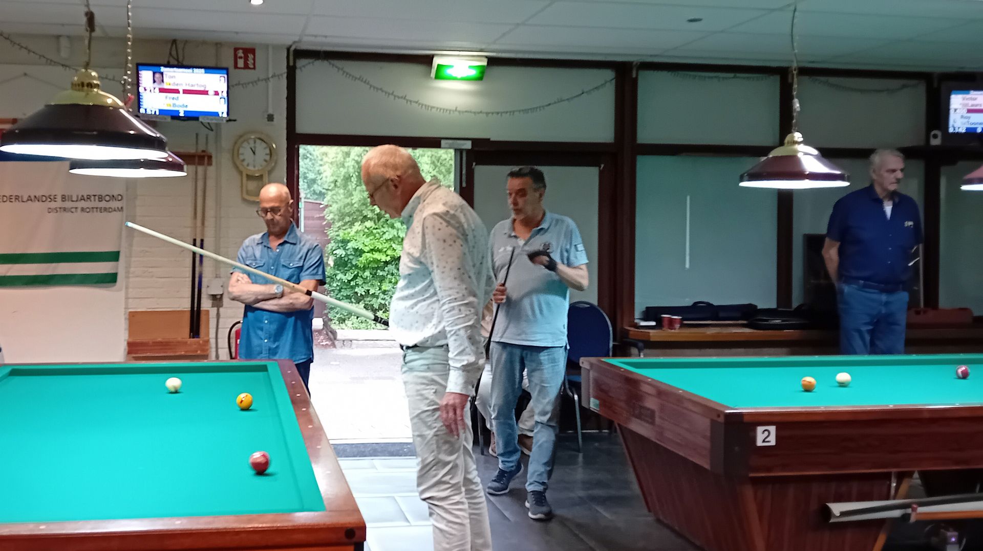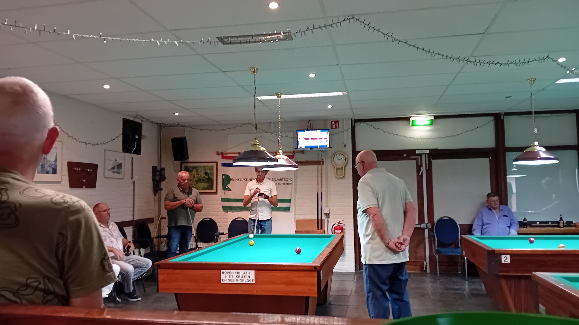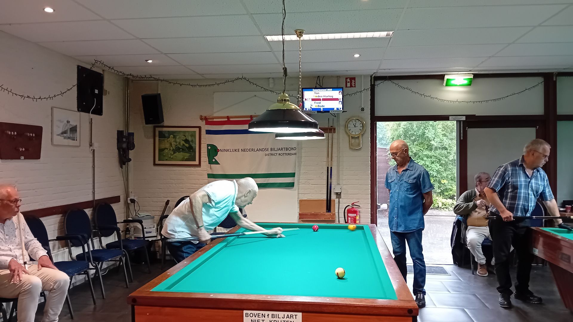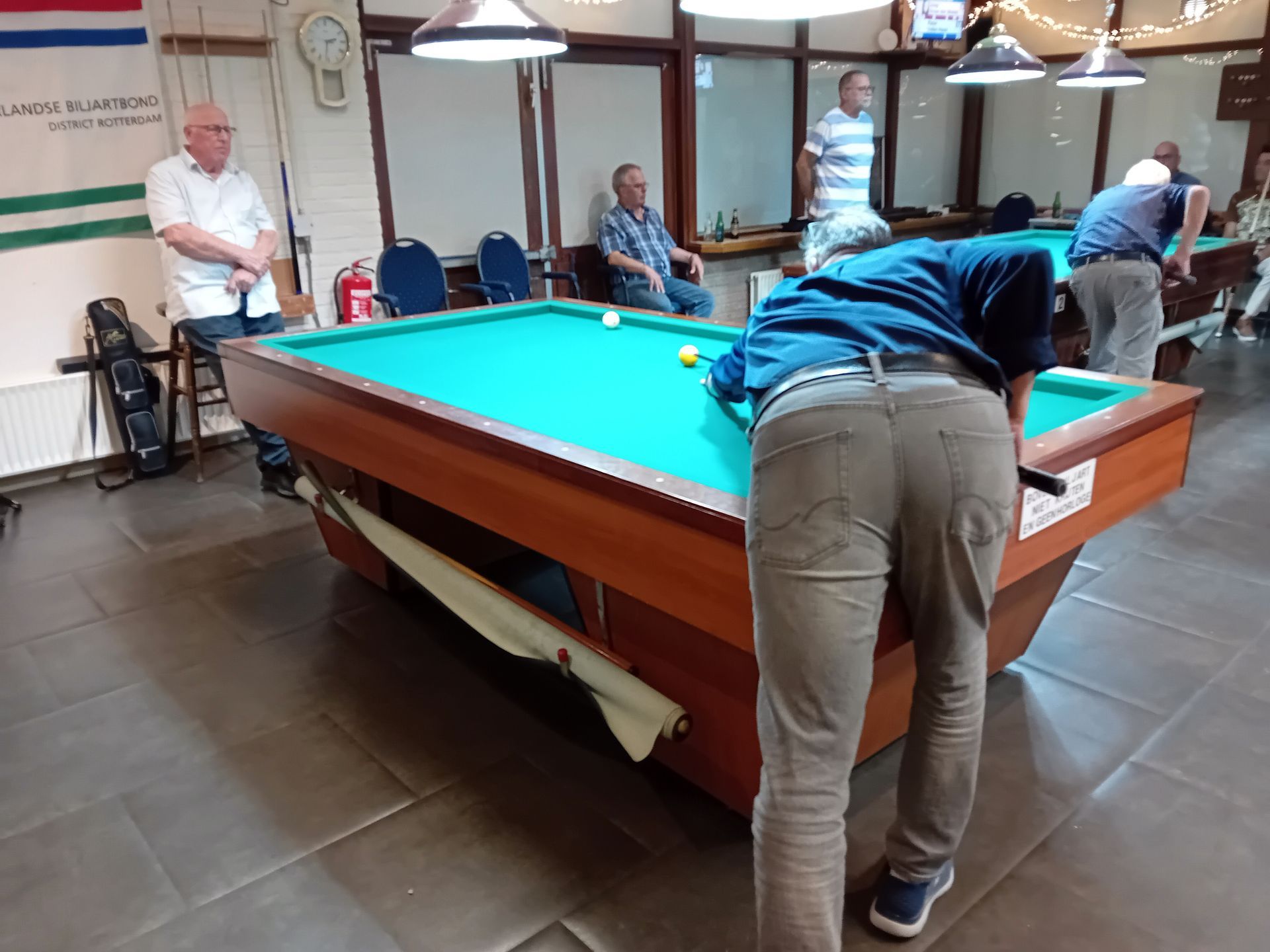 Henk Nossent is weer terug van vakantie en die kon er gelijk tegen aan. Hij was nog wel in de vakantie modus . We hebben een wereld partij gezien tussen Jan Teeuwe en Leo Steer. Ze hebben het elkaar wel moeilijk gemaakt en we hebben hele mooie driebanders gezien. Peter de Haan heeft tot nu toe drie partijen gespeeld en allle drie gelijkspel. Hierin had Peter steeds de nabeurt, dus ....wel degelijk een prestatie met al die zenuwen. Vereniging Charlois doet voor het eerst mee. Dhr Bode, ik denk onze oudste speler is zeer enthousiast en weet ze wel degelijk te raken.Dit was het weer, bedankt weer voor de gezelligheid. Een ieder heeft weer goed gepresteerd. Tot woensdag allemaal.