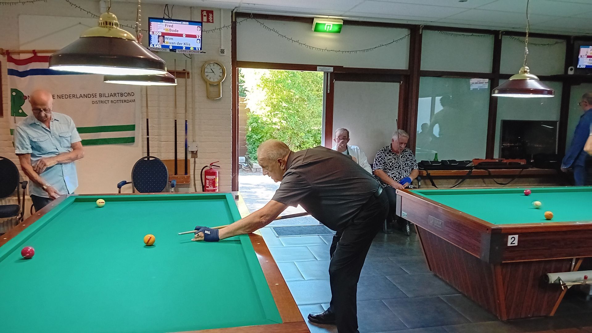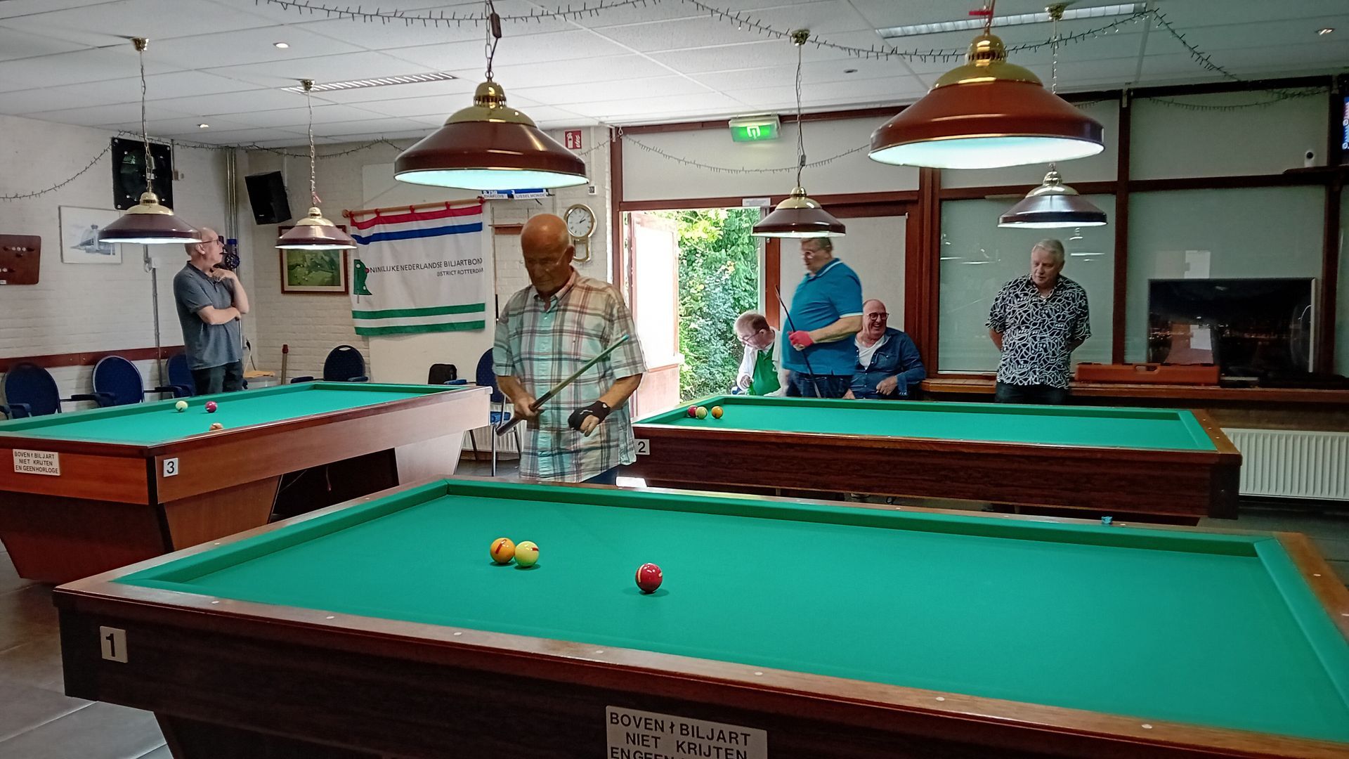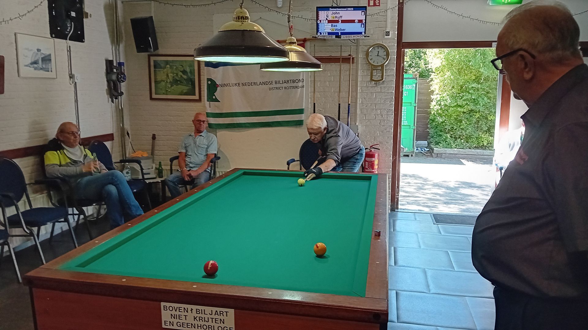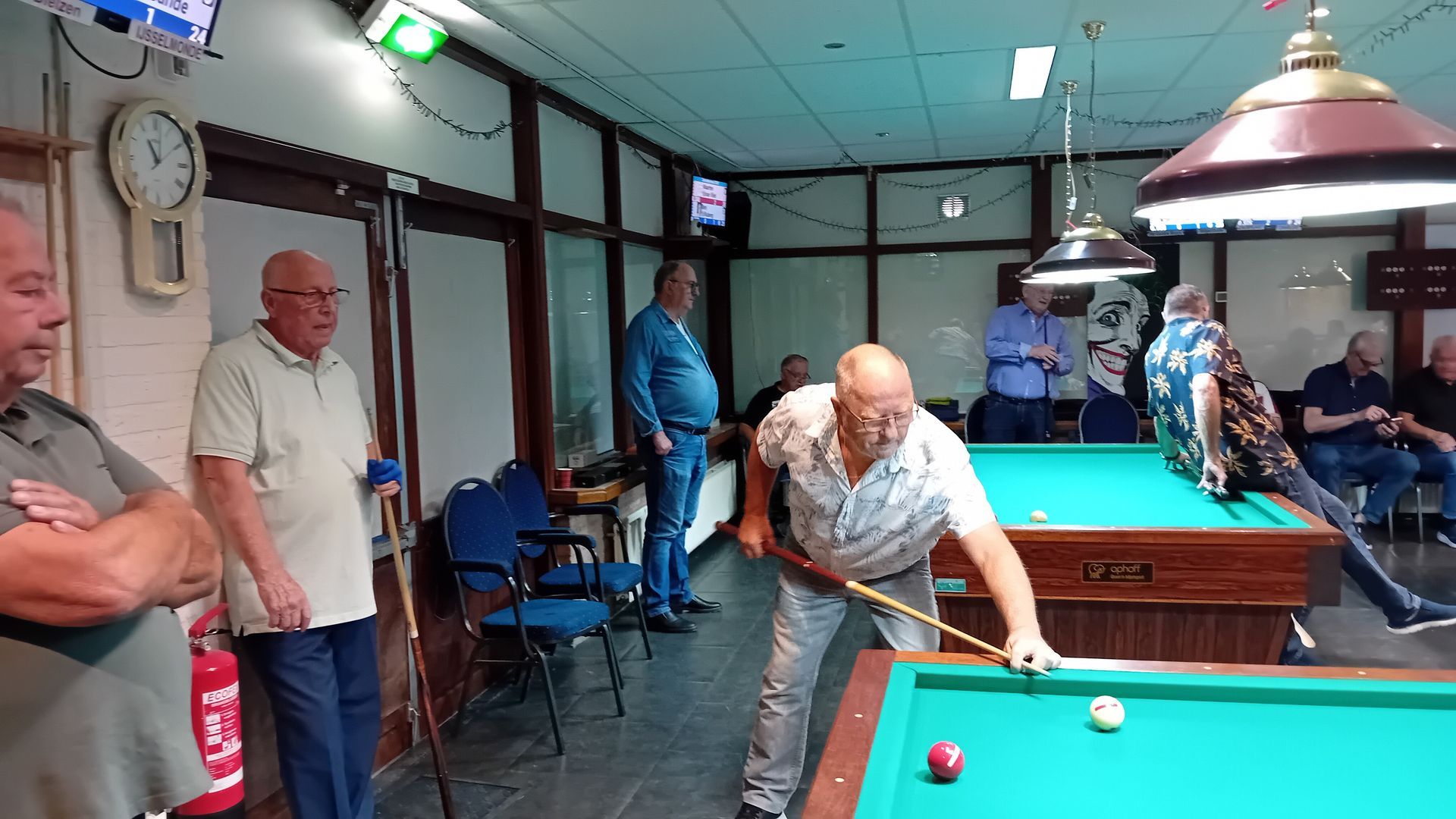 Henk Nossent is weer terug van vakantie en die kon er gelijk tegen aan. Hij was nog wel in de vakantie modus . We hebben een wereld partij gezien tussen Jan Teeuwe en Leo Steer. Ze hebben het elkaar wel moeilijk gemaakt en we hebben hele mooie driebanders gezien. Peter de Haan heeft tot nu toe drie partijen gespeeld en allle drie gelijkspel. Hierin had Peter steeds de nabeurt, dus ....wel degelijk een prestatie met al die zenuwen. Vereniging Charlois doet voor het eerst mee. Dhr Bode, ik denk onze oudste speler is zeer enthousiast en weet ze wel degelijk te raken.Dit was het weer, bedankt weer voor de gezelligheid. Een ieder heeft weer goed gepresteerd. Tot woensdag allemaal.