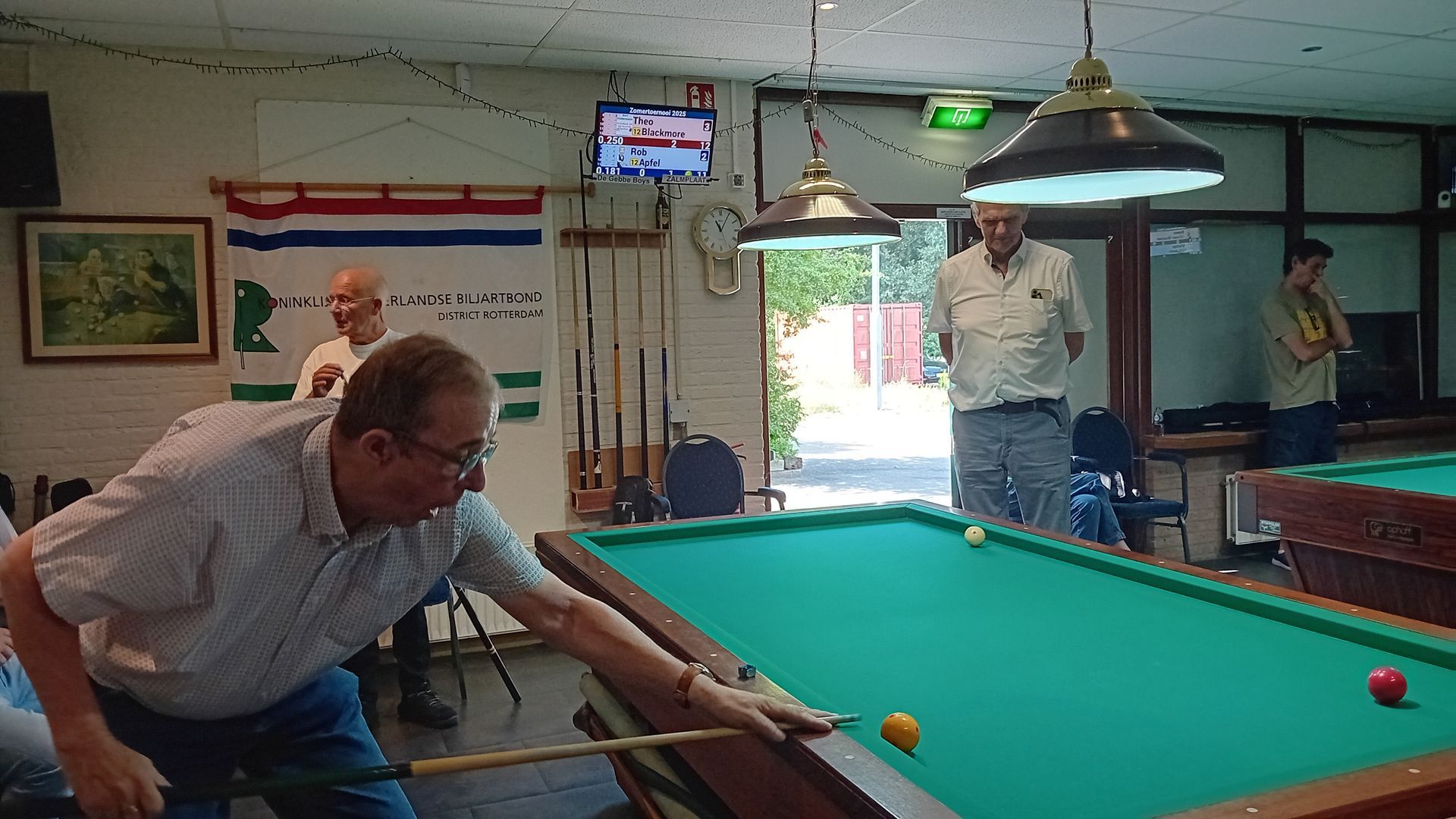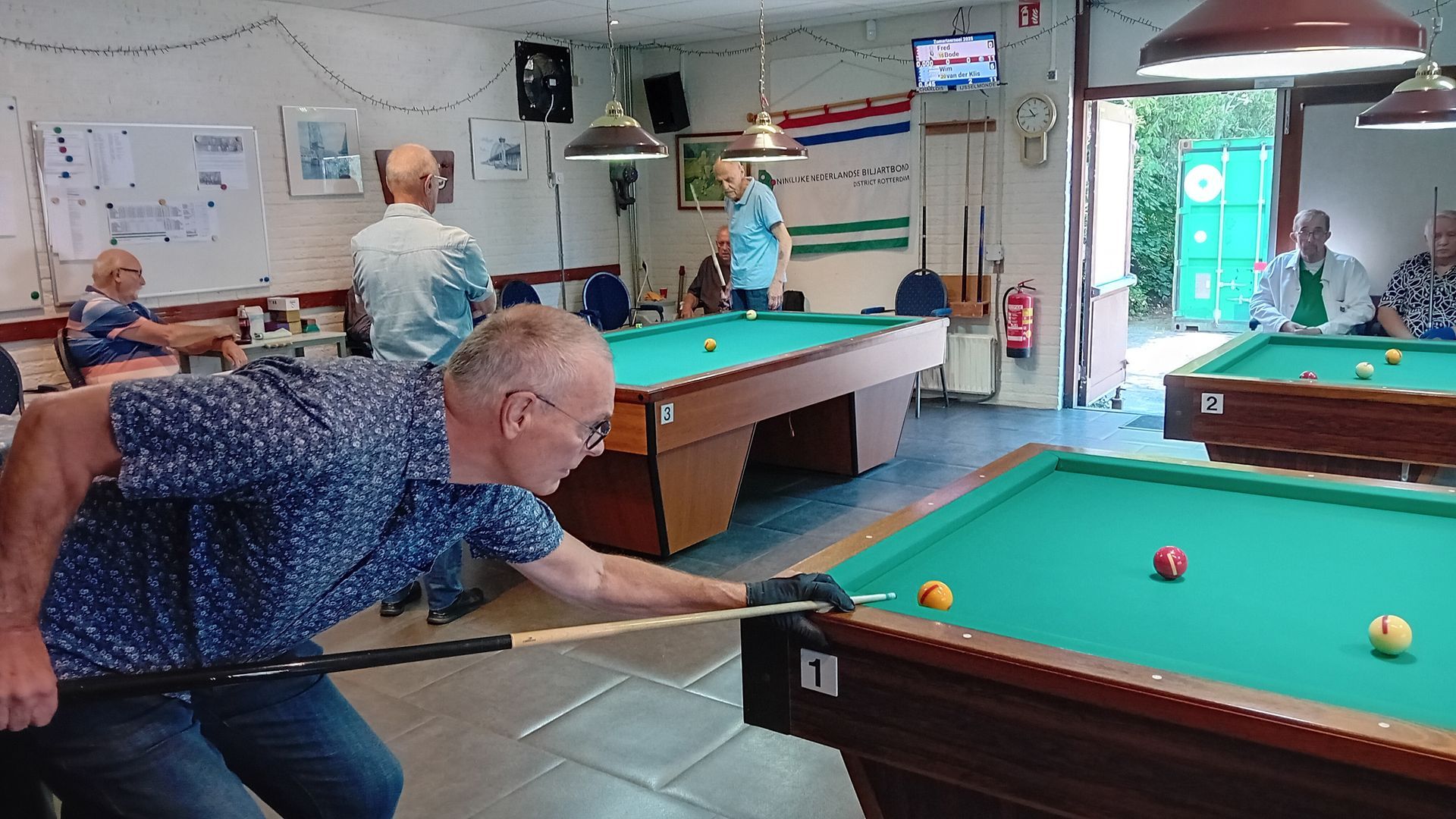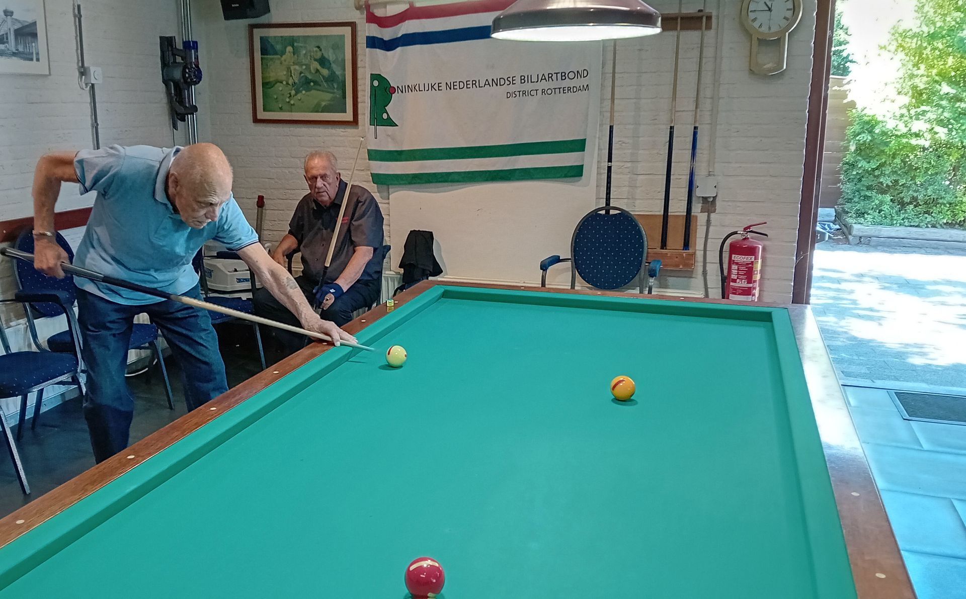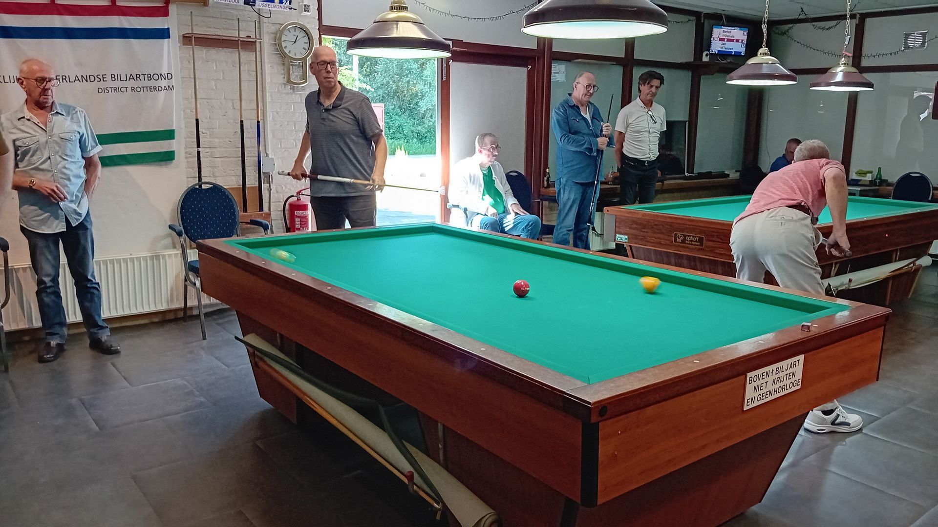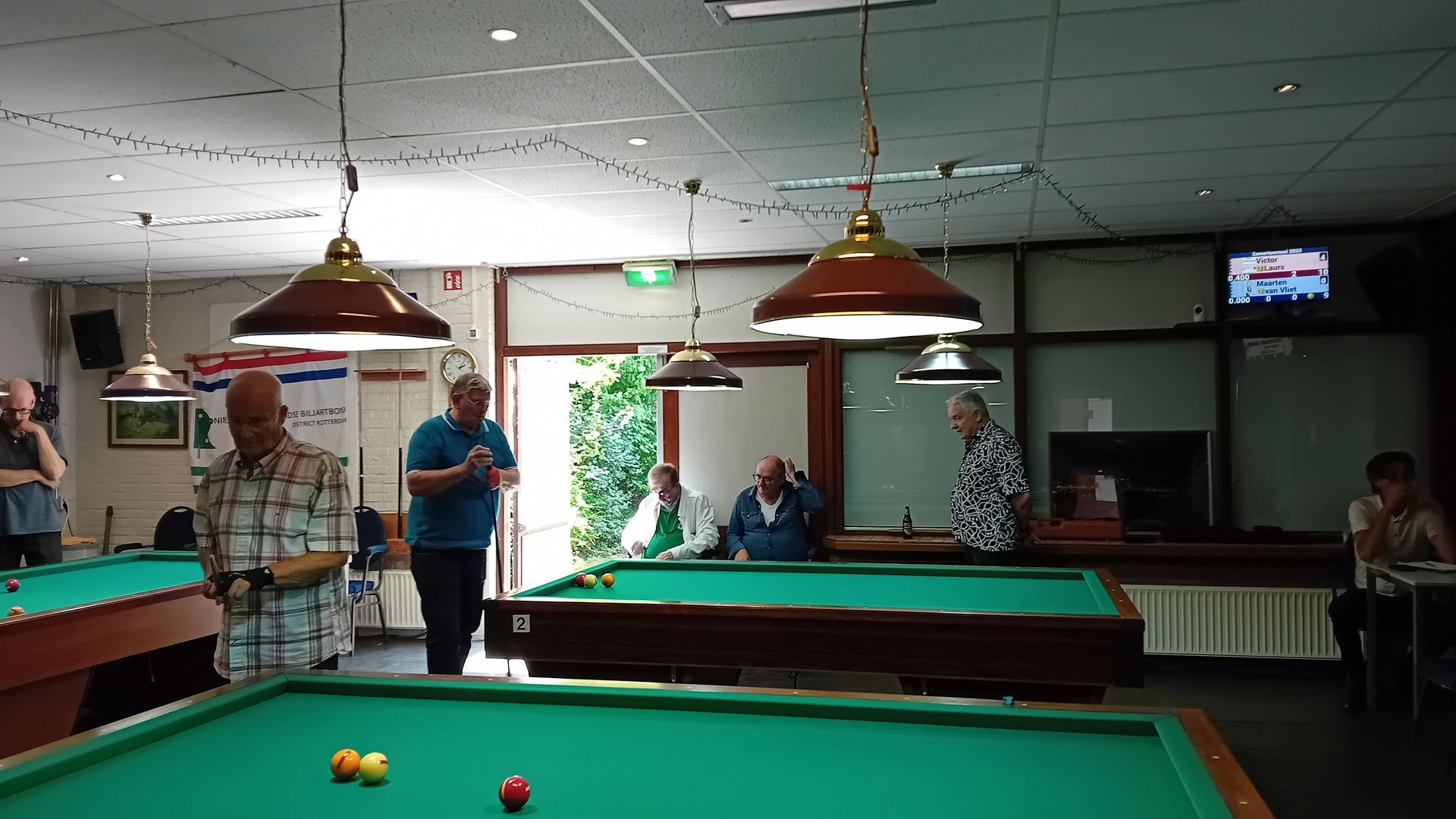 Henk Nossent is weer terug van vakantie en die kon er gelijk tegen aan. Hij was nog wel in de vakantie modus . We hebben een wereld partij gezien tussen Jan Teeuwe en Leo Steer. Ze hebben het elkaar wel moeilijk gemaakt en we hebben hele mooie driebanders gezien. Peter de Haan heeft tot nu toe drie partijen gespeeld en allle drie gelijkspel. Hierin had Peter steeds de nabeurt, dus ....wel degelijk een prestatie met al die zenuwen. Vereniging Charlois doet voor het eerst mee. Dhr Bode, ik denk onze oudste speler is zeer enthousiast en weet ze wel degelijk te raken.Dit was het weer, bedankt weer voor de gezelligheid. Een ieder heeft weer goed gepresteerd. Tot woensdag allemaal.