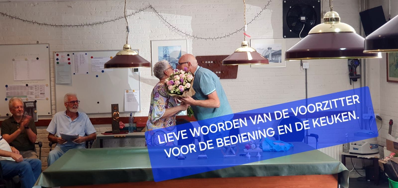 Henk bedankt het bar en keukenpersoneel voor hun inzet. Zij worden heel erg in het zonnetje gezet met een hele mooie bos bloemen πen een enveloppe.